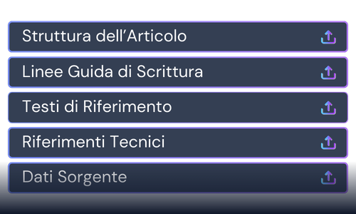 Carica i tuoi brief, le regole SEO o esempi di articoli. Tono, struttura e istruzioni vengono applicati automaticamente.